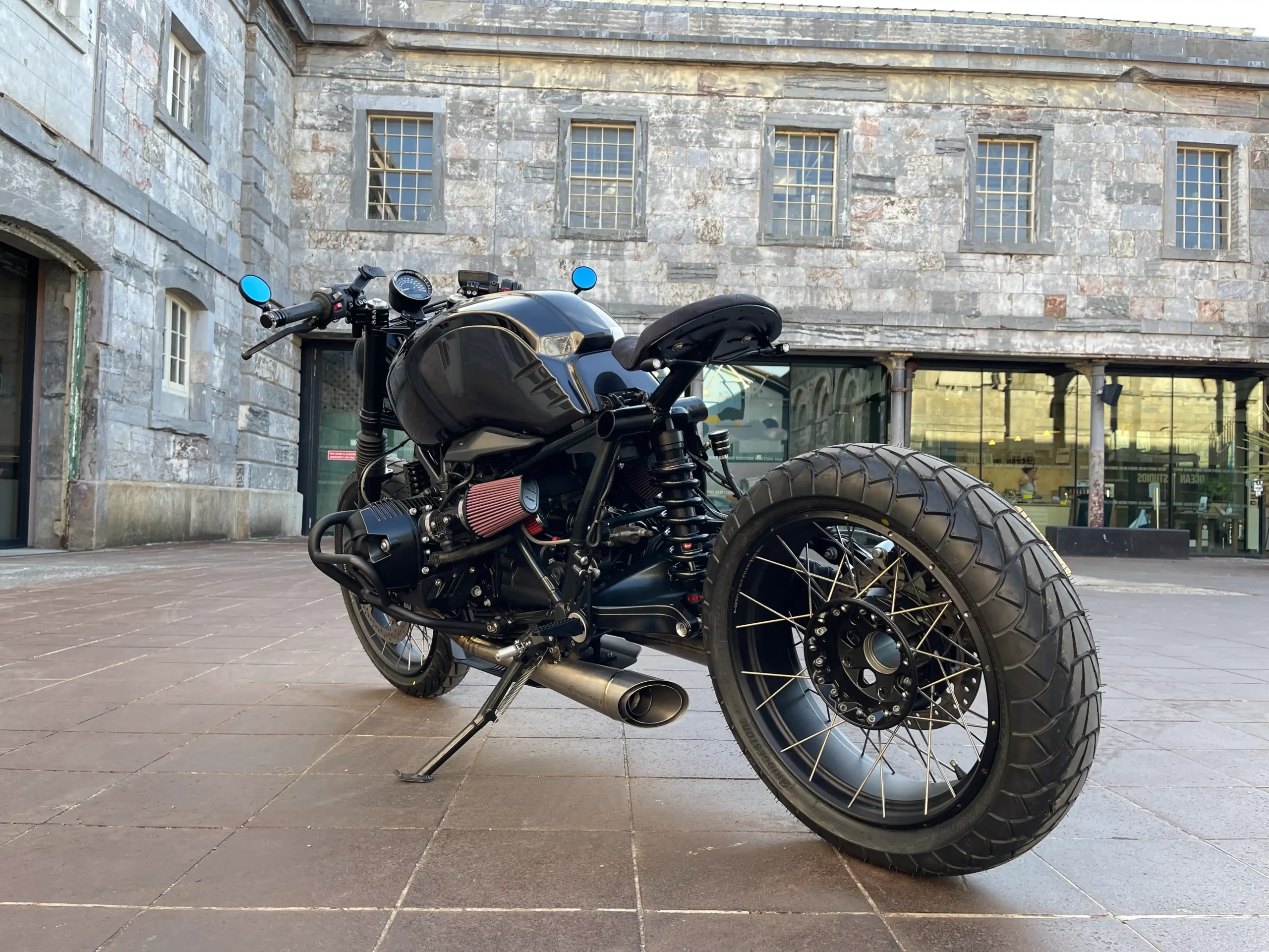 The R nineT Graphite rides on tubeless rims with Bridgestone tyres. The rear suspension was upgraded with a Wilbers shock for better handling and comfort. The bars were replaced with clip-ons, and a set of bar-end mirrors completes the front end.