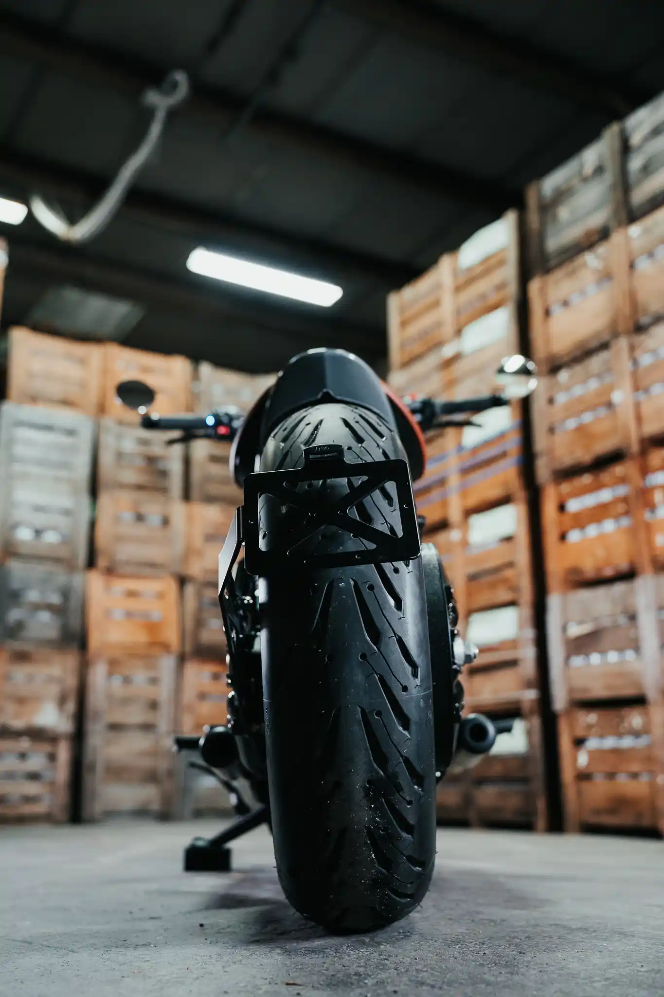 The chassis was tuned for control. The Thruxton inverted fork sharpens front-end feedback. Shock Factory adjustable rear shocks, made for this build, keep the ride stable and smooth. Satin black 17-inch spoked wheels with stainless spokes wear Michelin Road 6 tyres. Brembo brakes with wave discs and aviation hoses give strong, consistent stopping power.